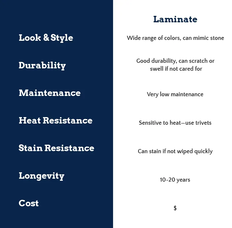 From budget-friendly laminates to luxurious quartz and timeless granite, we offer countertops solutions to match style, needs and budget. Click below to learn more about each material.